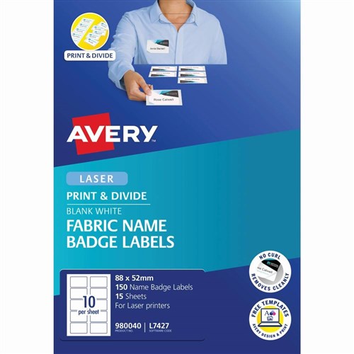 Avery Fabric Name Badge Laser Labels White L7427 88x52mm 10UP 150 Labels 15 Sheets