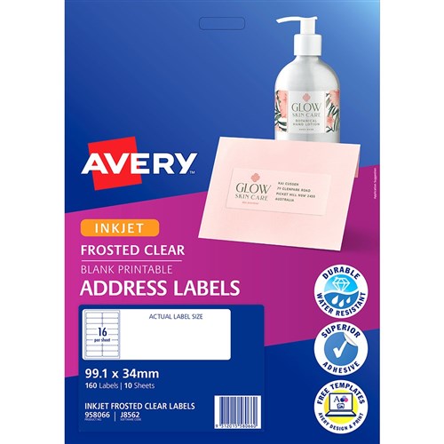 Avery Frosted Clear Inkjet Address Labels J8562 99.1x34mm 16UP 160 Labels 10 Sheets