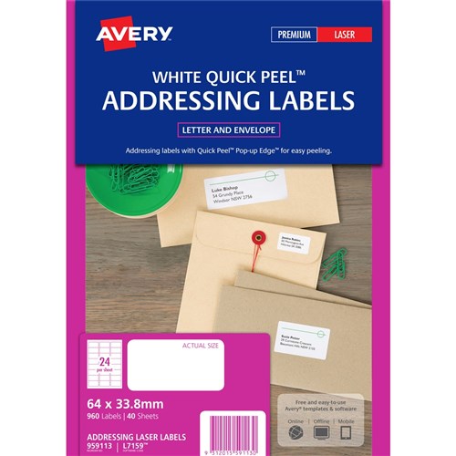 AVERY L7159 MAILING LABELS Laser 24 L/P/Sht 64x33.8mm Address Box of 960