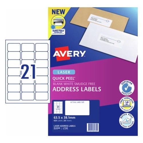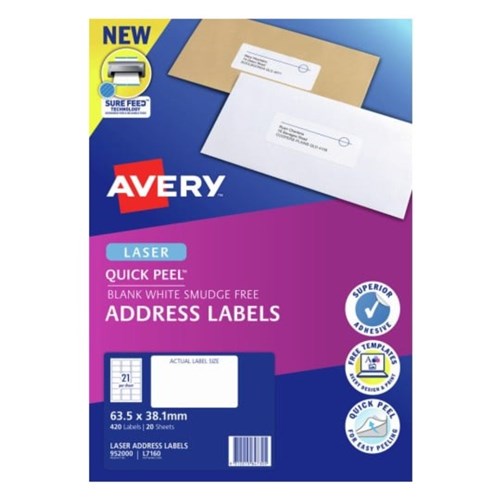 Avery Quick Peel Address Laser Labels White L7160 63.5x38.1mm 21UP 420 Labels 20 Sheets