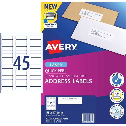 Avery Quick Peel Address Laser White L7156 58x17.8mm 45UP 4500 Labels 100 Sheets