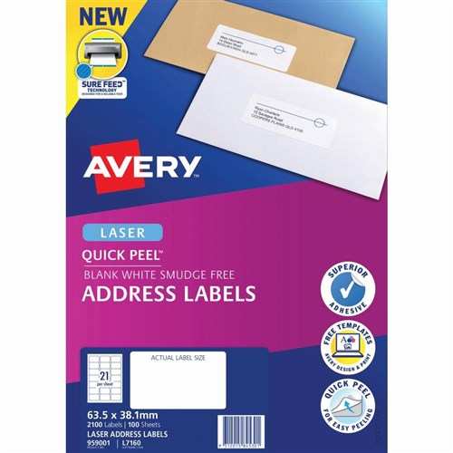 Avery Quick Peel Address Laser White L7160 63.5x38.1mm 21UP 2100 Labels 100 Sheets