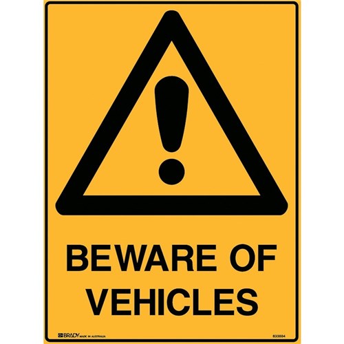 Brady Warning Sign Beware Of Vehicles 450W x 600mmH Polypropylene Yellow And Black