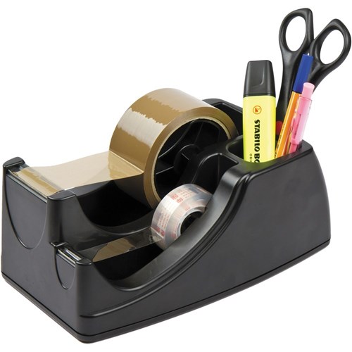 • This dispenser has two spindles and a place to hold your pens, scissors etc.
