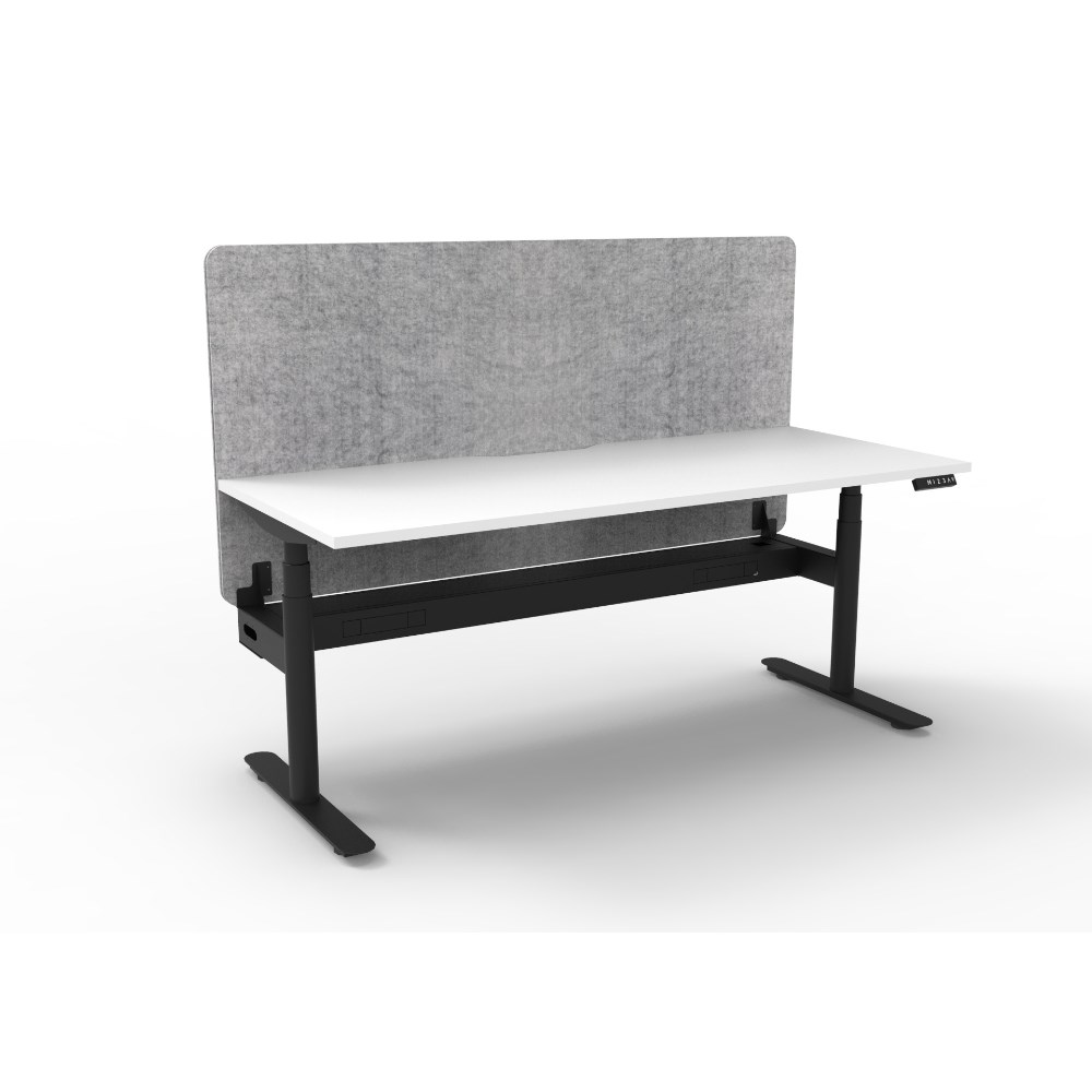 • Natural White worksurface with rigid edging and 50mm scallop cable cut out. E0 rated 25mm top. Black Satin powder coat round-leg frame. Eco screen and cable tray.