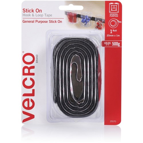 Velcro Brand Stick On Hook & Loop 25mm x 1m Tape Black